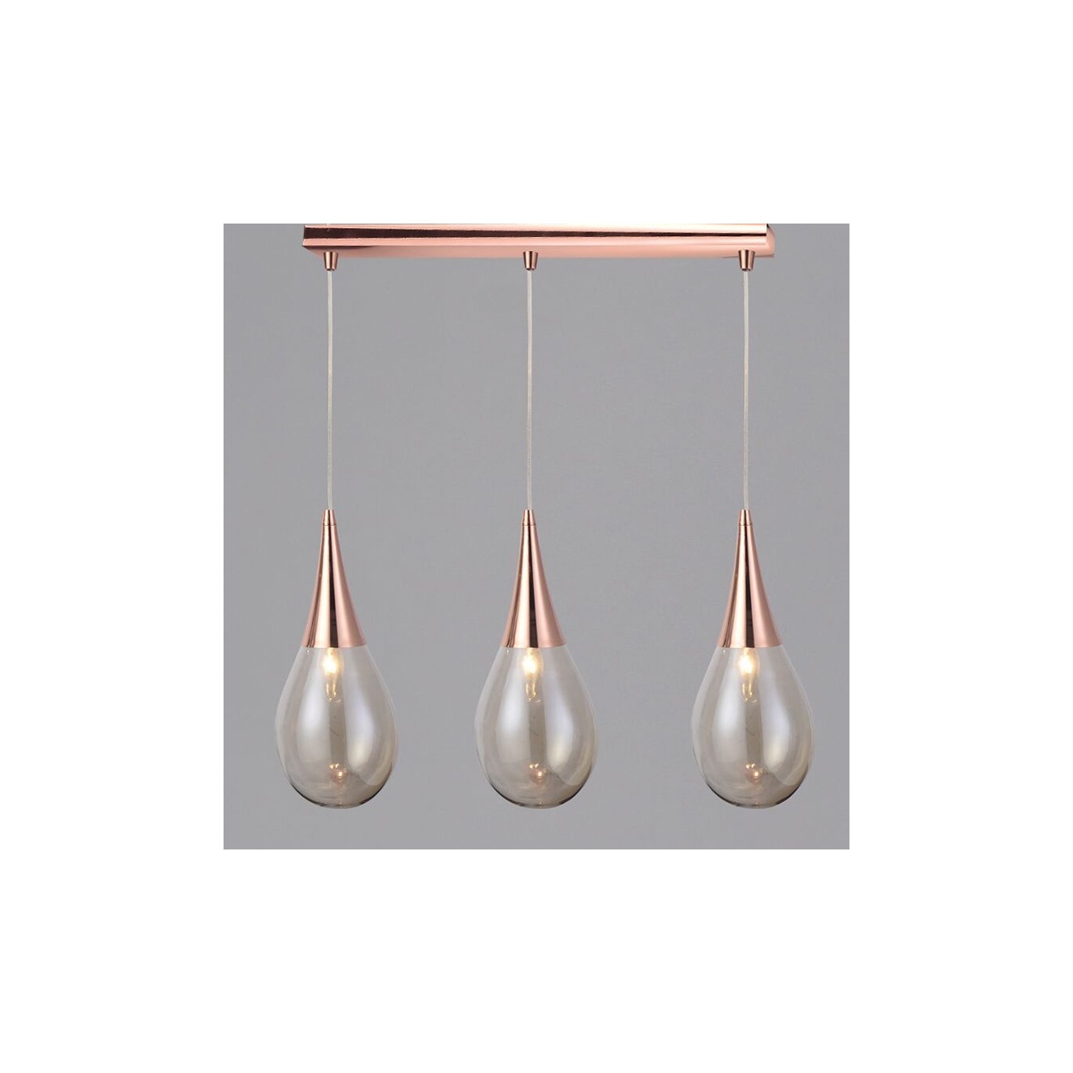 Κρεμαστό τρίφωτο μεταλλικό φωτιστικό ράγα σε χάλκινο χρώμα και γυάλινο κάλυμμα στο χρώμα του κεχριμπαριού.
